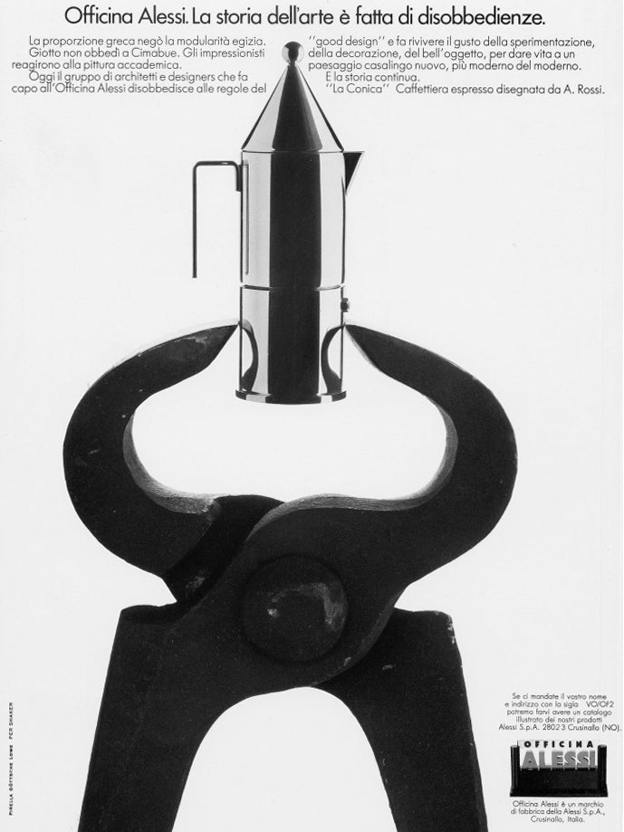 La conica wird seit 1984 hergestellt und ist eine Weiterentwicklung vonTea&Coffee Piazza, bei der große Architekten an der Gestaltung eines Kaffee- und Teeservices für Alessi beteiligt waren. Als Symbol für die dialektische Beziehung zwischen Architektur und häuslicher Landschaft verleiht La conica ihrem Namen neben der offensichtlichen geometrischen auch eine subtile Interpretation: Lakonien, das Land der Spartaner, ist die Wiege einer engen, prägnanten und direkten, ja lakonischen Sprechweise. Außerdem war das lakonische Hypokaustum in der Antike ein heißer Raum, nicht unähnlich dem Kessel einer Kaffeekanne.
