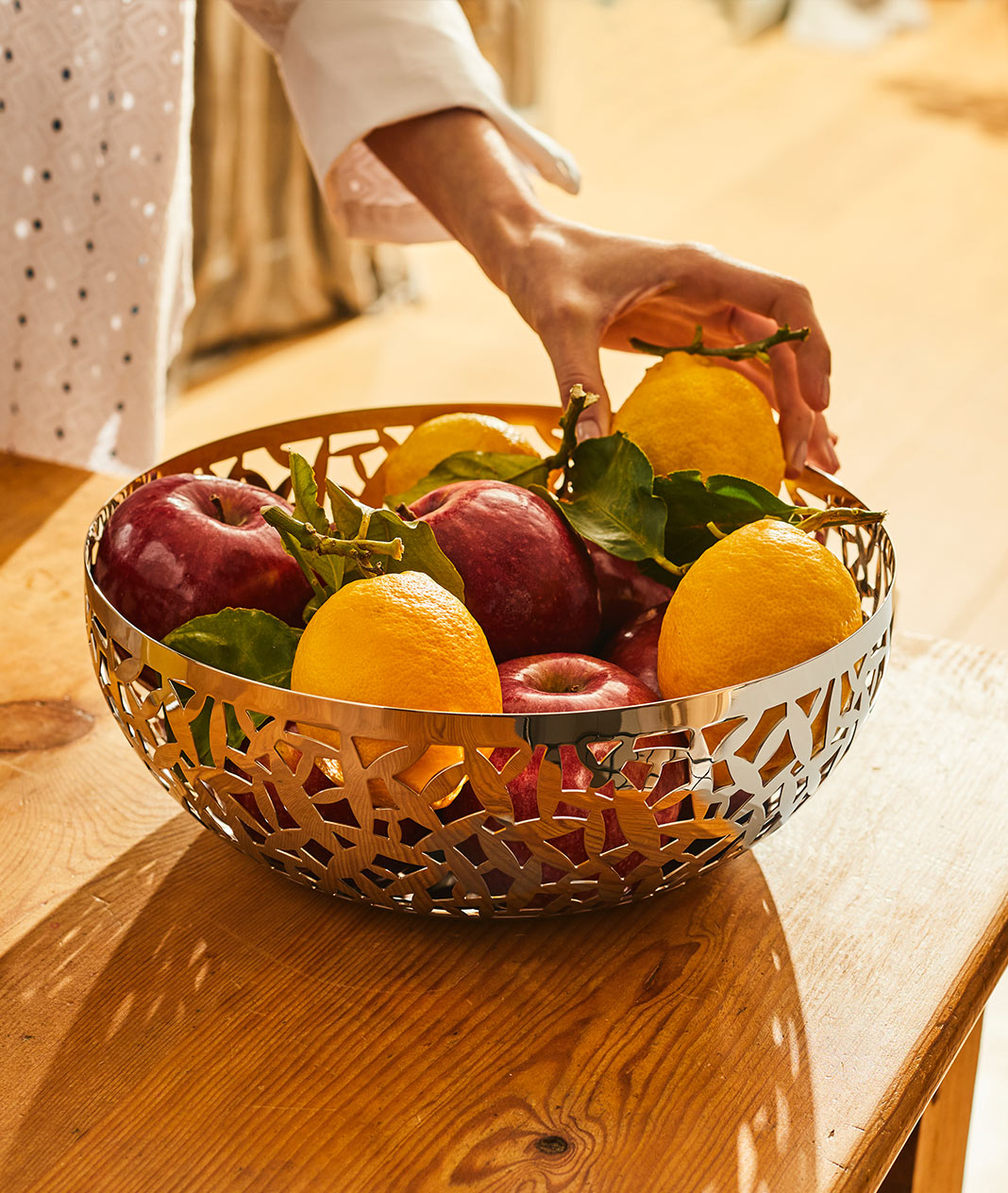 La técnica del calado se integra en el vasto ámbito de la decoración, una disciplina que, desde sus inicios, ha acompañado la evolución de la humanidad. Particularmente fascinante fue el uso del calado al inicio de la era industrial, a partir de la segunda mitad del siglo XIX, cuando la aplicación de motivos decorativos, ya sean naturalistas o geométricos, se utilizó para conferir mayor dignidad a los primeros productos industriales. ¡CACTUS! de Marta Sansoni es un ejemplo significativo de los resultados alcanzados por Alessi con esta técnica: una intrincada selva de hojas de cactus, un calado siempre igual y siempre diferente.