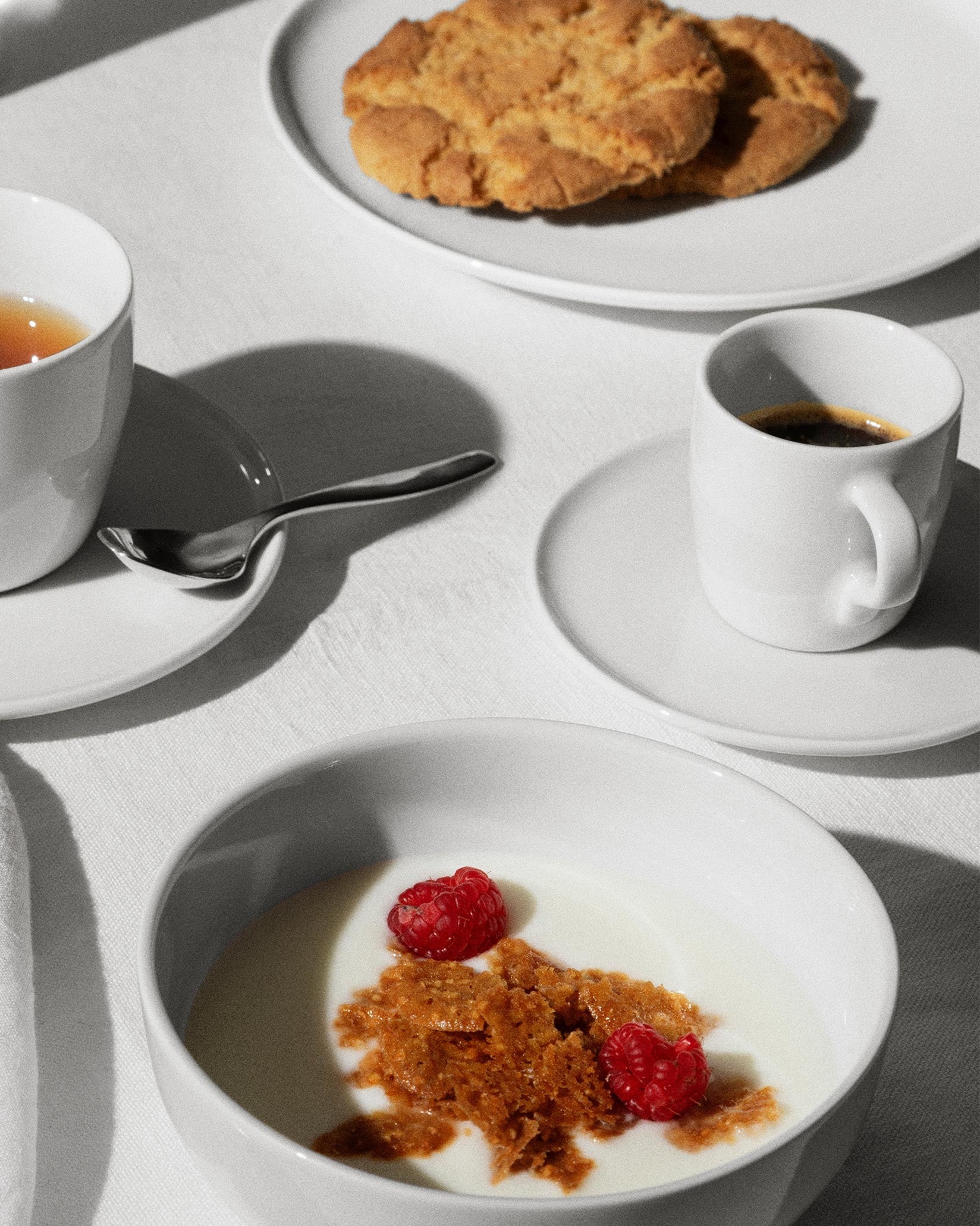 Set de una tacita para café con platito en porcelana blanca. 4 piezas