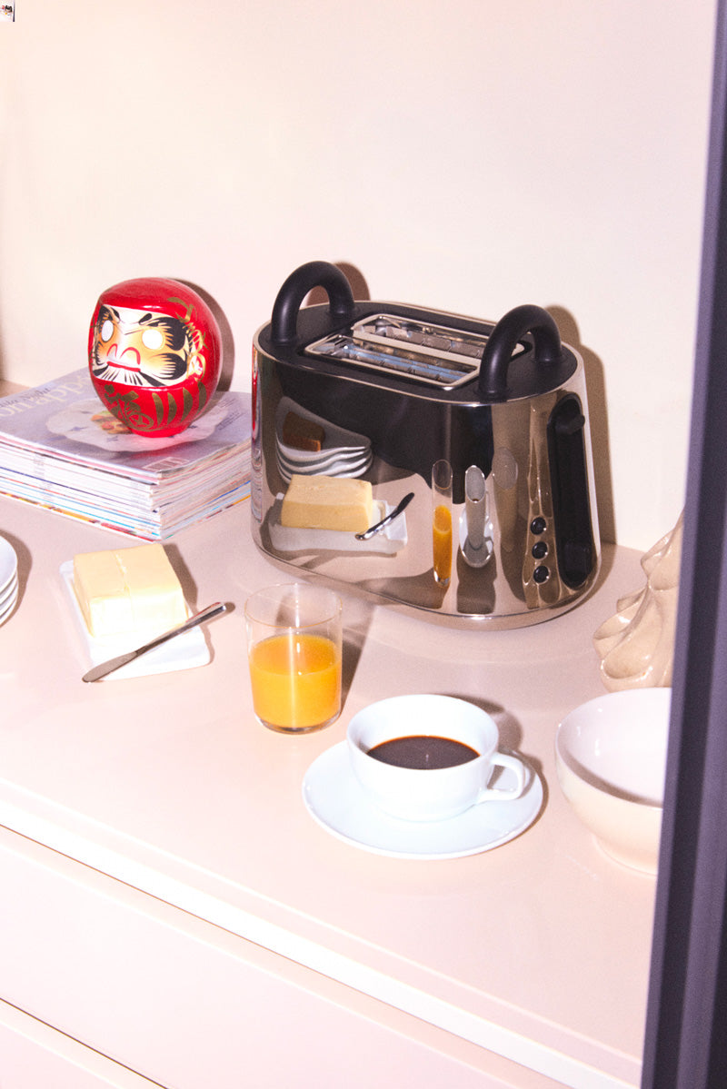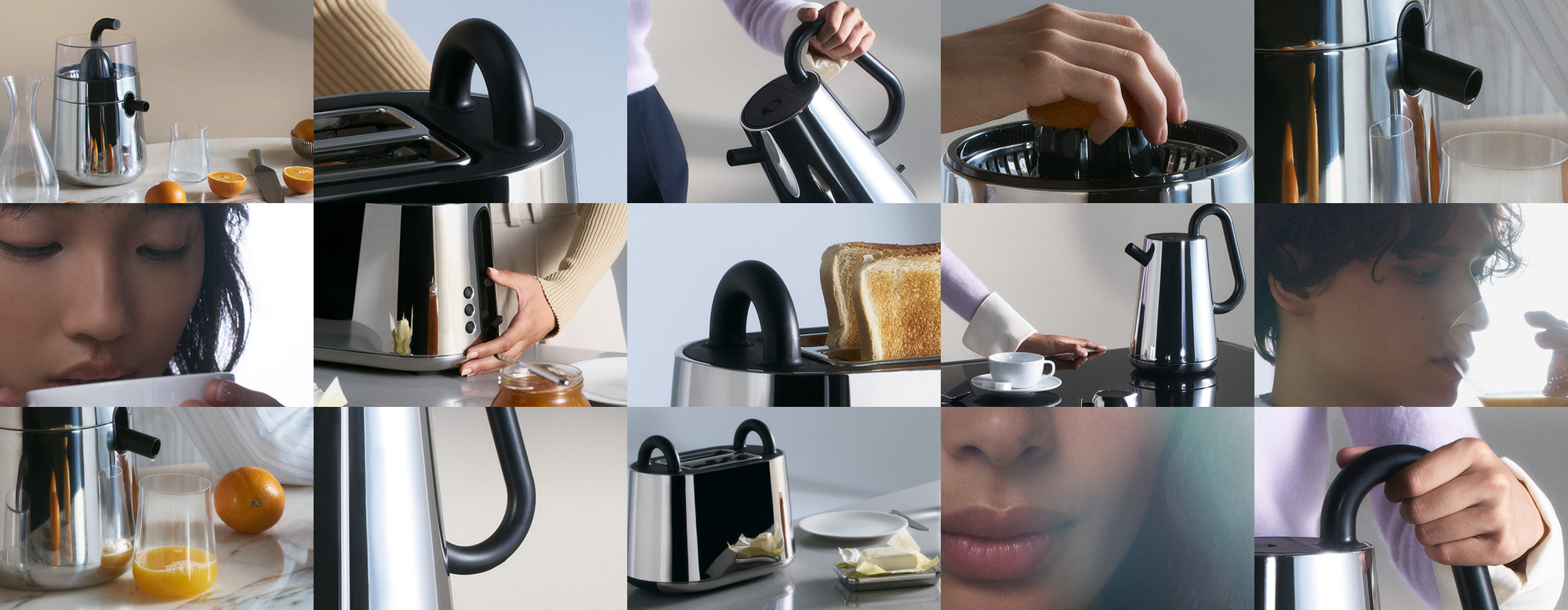 Lo spremiagrumi è composto da due volumi dal disegno ricercatamente minimale: un corpo in acciaio inossidabile sormontato da una calotta trasparente. La linea del profilo scompare sotto la base, dando l’illusione di una forma leggermente sospesa: un dettaglio che arricchisce l'esperienza complessiva dell’oggetto. Il tostapane è un monovolume dal tratto essenziale, dove il dettaglio che caratterizza la collezione entra e riaffiora dal corpo lucente dando vita a due comode impugnature. Insieme al tostapane, l’autore ha disegnato due accessori che possono essere acquistati per arricchirne le prestazioni: delle pinze per sandwich e una griglia scaldabrioche. Una composizione di forme ironica e giocosa ma sempre altamente confortevole, che si riflette in tutti gli elettrodomestici della serie: Toru mostra la capacità dello studio Nendo di trasformare concetti astratti in forme tangibili, dando vita a oggetti di un’eleganza senza sforzi e di una funzionalità senza compromessi.