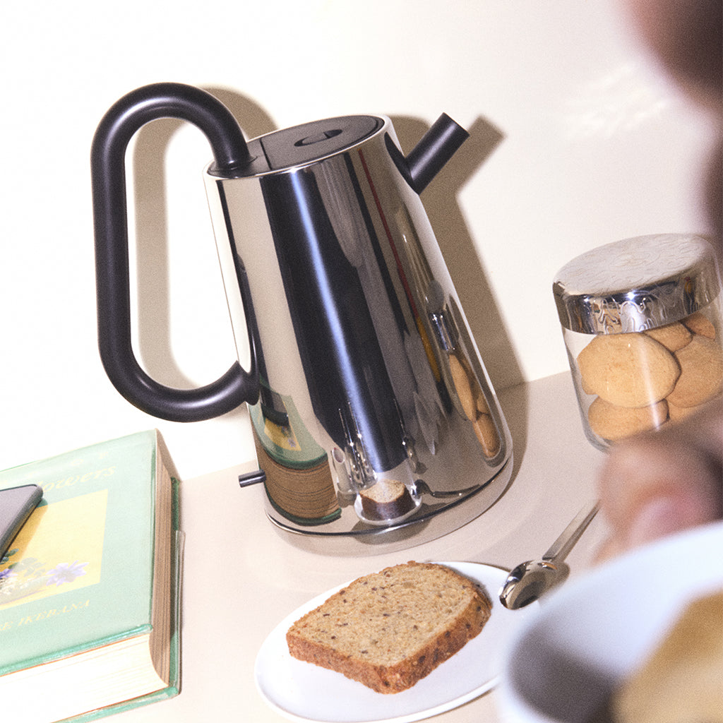 «Sfruttando le eccezionali tecniche di lavorazione del metallo di Alessi, che sono sempre state il cuore dell'azienda, il bollitore elettrico in acciaio inossidabile ha una forma semplice a brocca. La maniglia che sporge dalla parte superiore sembra passare attraverso il lato del corpo fino al becco», spiega Nendo. «Di solito il manico di un bollitore viene impugnato lateralmente, ma la forma sospesa in alto del manico di Toru permette di sollevare facilmente questo bollitore tenendo la parte superiore del manico».